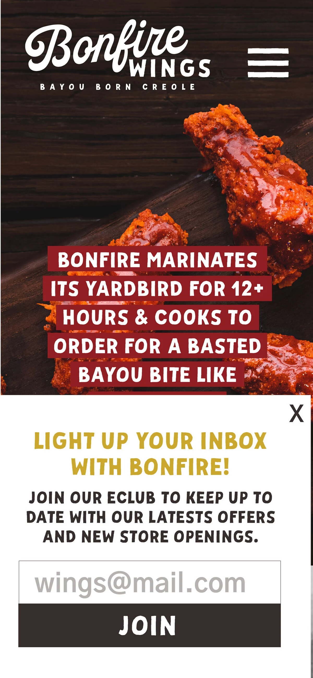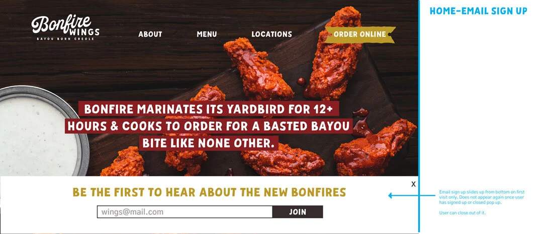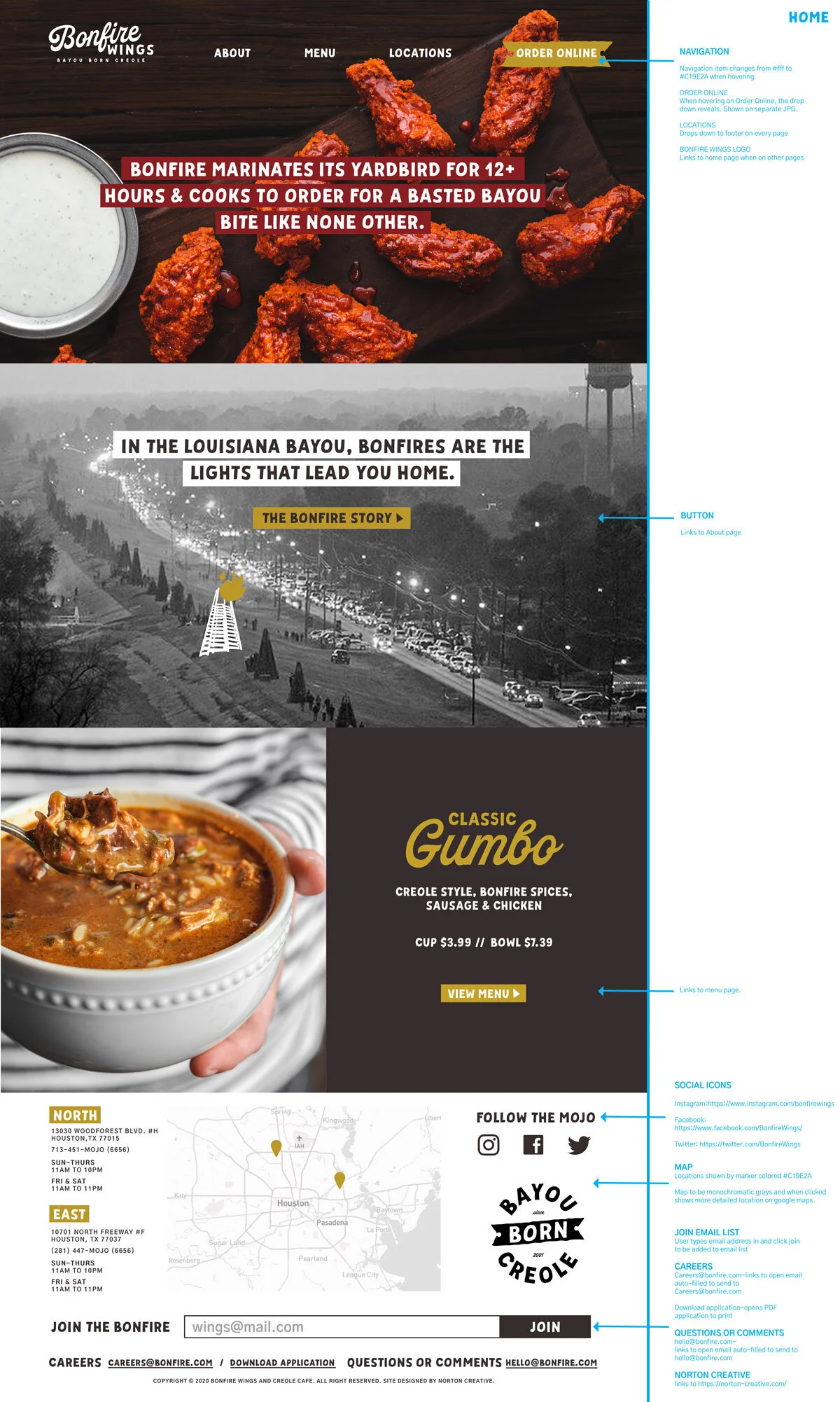 On the home page, we wanted to include a few sections to highlight the wings initially. Then learning about the Bonfire story for new patrons. And finally, a section highlighting their delicious gumbo. These sections would just be for the initial launch and could be easily updated by the client or our team with new content like limited-time menu items or an item they are pushing for that quarter.