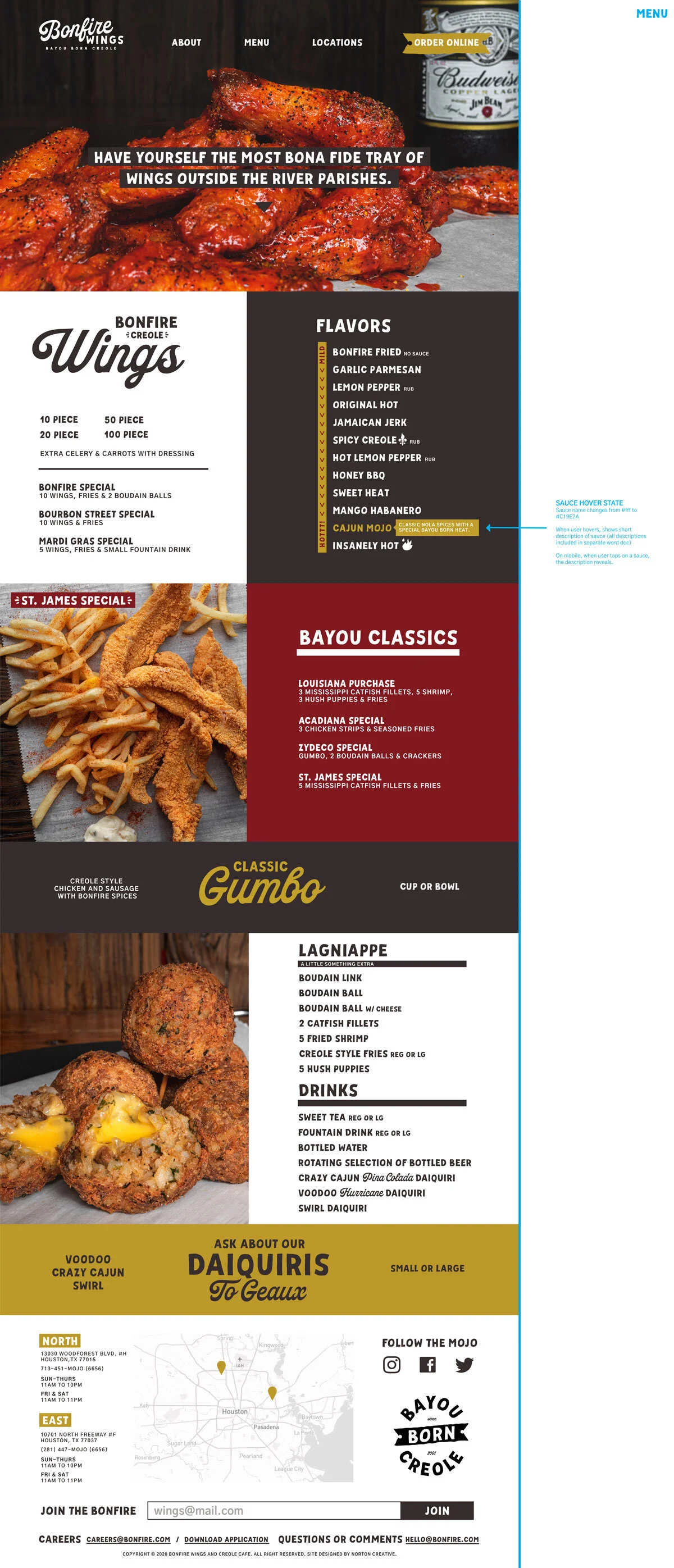 In conjunction with rebranding and updating in-restaurant menus, Bonfire Wings asked our team to create an updated website. The only mandatory from the client is making sure it is responsive and worked well for viewing on mobile as their business includes a good portion of pick up and take out orders. Keeping the functionality in mind, I wanted to include the Creole and Cajun history important to the brand and food. To do this, I included a few black and white vintage photos along with some subtle animations to incorporate the naming history. Bonfire Wings is named for the history behind bonfires in Louisiana. People living in the swamps and along the bayous would build and burn bonfires on Christmas Eve to help light the “road” to Christmas Eve mass.