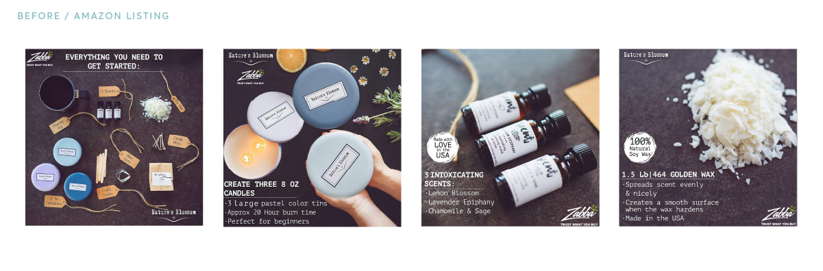 When first acquired, Nature’s Blossom had conflicting branding on Amazon with two different look and feels competing against each other on the search results page. During the analysis and strategy sessions with the brand managers, we decided to: