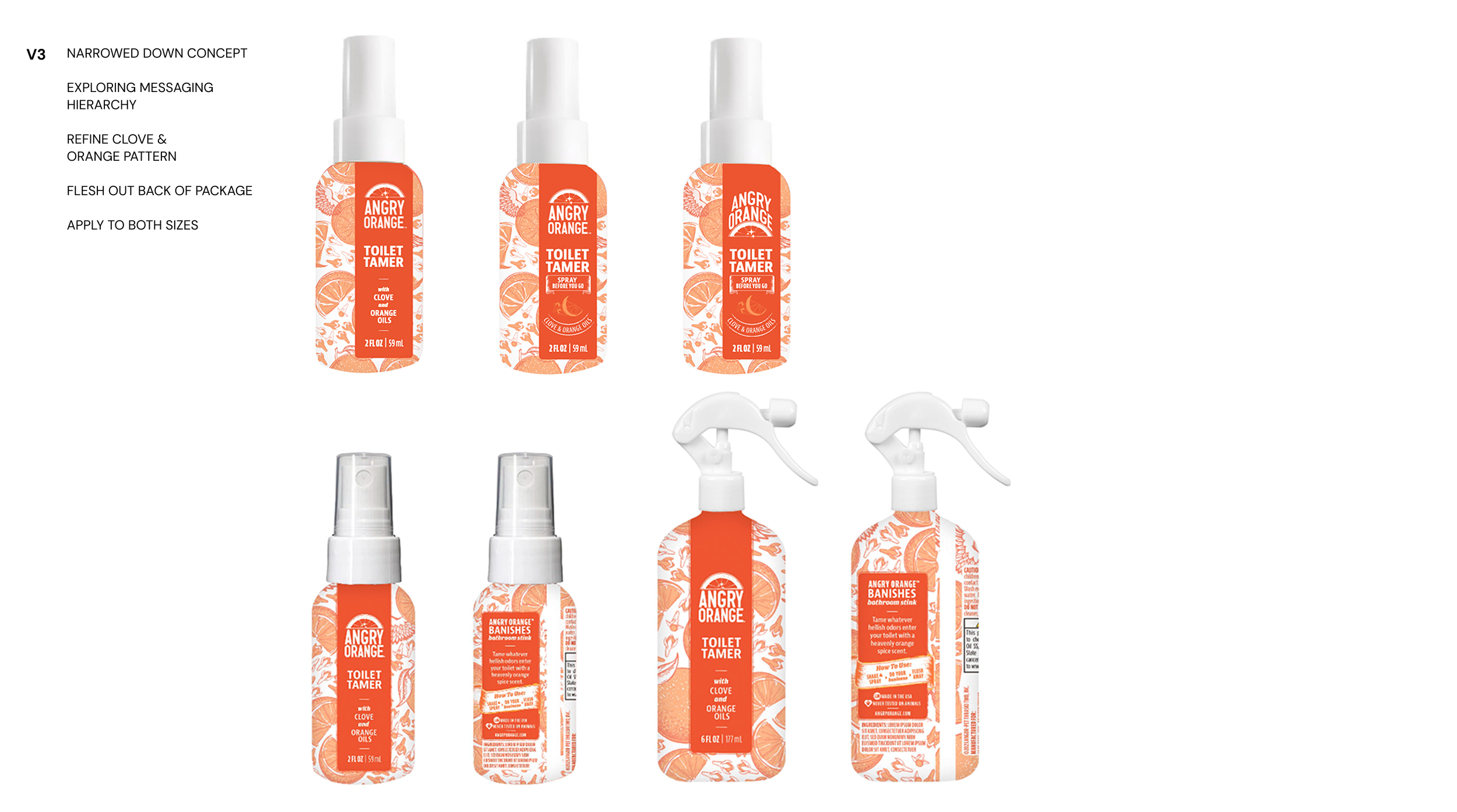 As a team, we explored both naming and look and feel on the packaging as the starting point of the rebrand. After testing initial concepts, the data showed that concepts that were more vulgar or potty-mouthed (Turd Terminator or Poop Punishing) might alienate or cause people to avoid purchasing Angry Orange toilet spray over more palatable brands. We also found it important to highlight the unique scent of our product, citrus and clove. Angry Orange’s citrus scent carries recognition and clout with existing brand customers so we wanted to reinforce that this is just as good as the brand’s pet products. Cross-functional partners felt strongly about the new branding being more discreet and aesthetically pleasing for those who choose to leave it out in the bathroom.